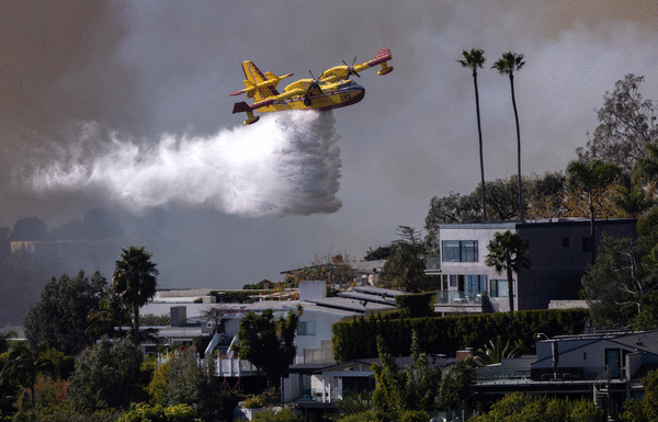 Water-dropping helicopters initially were not able to fly because of the wind, according to the agency, but around 1:40 a.m. they began launching an aerial attack with support crews on the ground. News footage captured the charge, with walls of flames towering over homes and firefighters with hoses running into backyards.