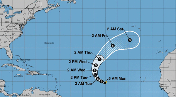 As of the National Hurricane Center’s 5 a.m. advisory, Lorenzo had 45 mph sustained winds located about 1,095 miles west of the Cape Verde Islands moving northwest at 17 mph.