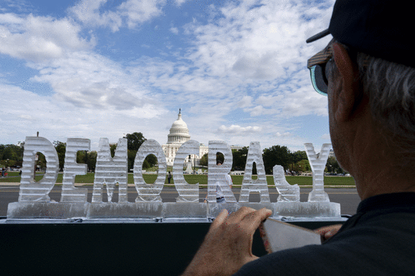 WASHINGTON — As the government shutdown enters its third week with no clear end in sight, a 3,000-pound ice sculpture was unveiled on the National Mall, spelling out the word “democracy.”