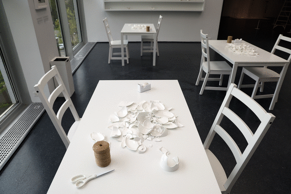 There’s also a room of tables covered with the shattered chunks of ceramic cups and dishes. Ono provides tape and string and asks you to repair them. It’s not so different from the time, during a performance, she smashed a vase and asked the audience to bring home one shard each — but only if they agreed to meet back in a decade and try to repair the vase. Try is the key word there.