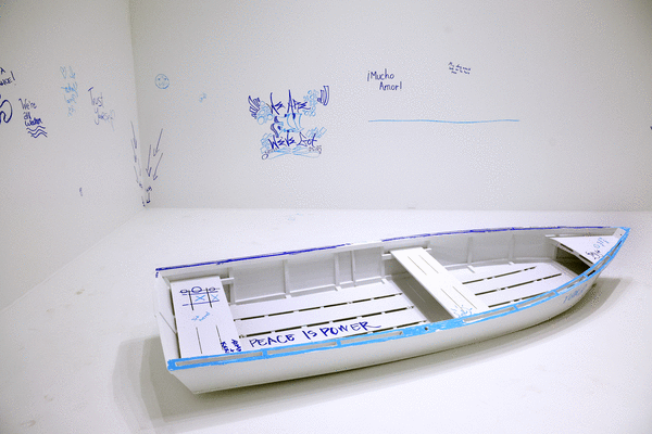 At the same time, so much of “Yoko Ono: Music of the Mind,” so much of her practice requires the audience to become a part of its creation. Gallery after gallery, work by work, you receive instructions. Her remarkable “Instructions for Paintings,” lined up along a gallery wall, don’t offer traditional paintings but, yes, instructions for them, often reading like Zen koans: “Cut a painting up and let the pieces be lost in the wind…” A white full-sized rowboat in a white room — conceived in the early 1960s, but only realized in 2016 after Ono saw news accounts of migrants risking their lives to reach European shores — asks viewers to pick up a nearby blue marker and help paint the boat (and room) a solid ocean blue. “Bag Piece” offers you one of several large black sacks hanging on a wall: Climb inside, pose, create an abstract sculpture. (If you’re hesitant or worried about being embarrassed, just know that John Lennon once climbed into a bag, enthusiastically.)