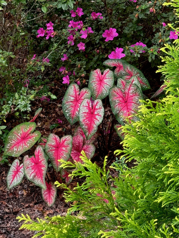 The Heart to Heart Radiance caladium leaves are large and electrifying in color. They have some hot pink, white, green and sizzling red veins. The chartreuse conifers create a party atmosphere, and adding the best summer/fall bloom of azaleas was like an October garden fest.