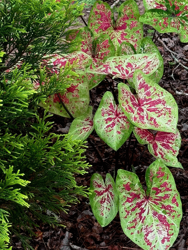 Along this "river of caladiums" I have three gold chamaecyparis or false cypress and three golden needled Fluffy arborvitae. The golden chartreuse of the conifers really contrasts with the colorful leaves of the Heart to Heart caladiums.