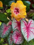 When I posted the photo on my Facebook page, I quickly got a complaint that you could not do that as the hibiscus is a sun plant and the caladium a low-light plant. So, a reminder to read your varietal tags as some Heart to Heart caladiums can also grow in the sun.