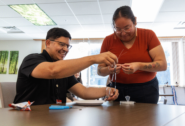Kristah Warrington, the college’s Indigenous wellness director, carefully laced a Menominee finger-woven belt in a sunlit room. Her hands danced through the yarn, a blur of blue and purple hues. She leads the activity for students weekly, and is also enrolled part time in Menominee language classes.