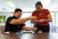 She surveys her work beside her peers. “I’m just trying to figure out which color wire I put through,” Fuentez said, pointing to a metal switch plate.