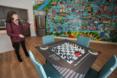 Inside the community room of a new subsidized apartment building at 2000 Ridge Ave., what was originally going to be a blank white wall became a mural featuring a map of the neighborhood with cultural landmarks. The room also features tabletops with activities, such as chess, matching games, word games, and storytelling prompts.