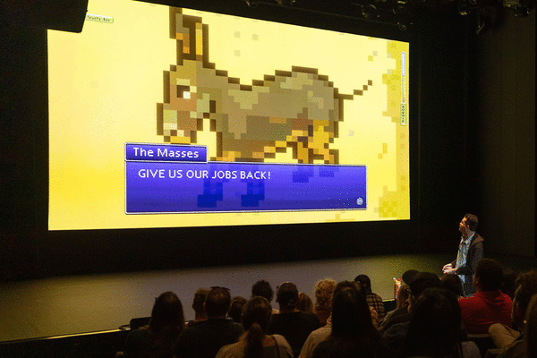 In a city that's been ravaged by fires, ICE raids and a series of entertainment industry layoffs, the sold-out crowd of nearly 300 was riled up. Chants of "ass power!" — the donkey's protest slogan — were heard throughout the day as attendees politely gathered near a single video game controller on a dais to play the game, becoming not just the avatar for the donkeys but a momentary leader for the collective. Cheers would erupt when a young donkey reached the conclusion that "I kinda think the system is rigged against everyone." And when technological advances, clearly a stand-in for artificial intelligence, were described as "evil, soulless, job-taking, child-killing machines," there were knowing claps, as if no exaggeration was stated.