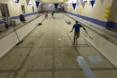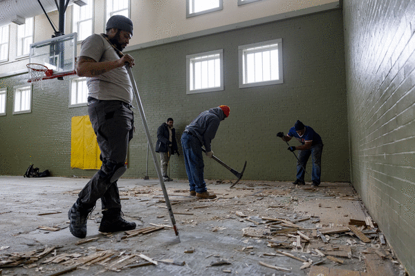 We walk into the gym, where workers are tearing up its wooden basketball court (not the original floor) with crowbars, stacking blonde slats in a corner. We pass its drained pool. We enter its grand ballroom, where a 30-foot-long mural, W.E. Scott’s “Mind, Body, Spirit,” has already passed through rounds of conservation. Its floor smells like sealant.