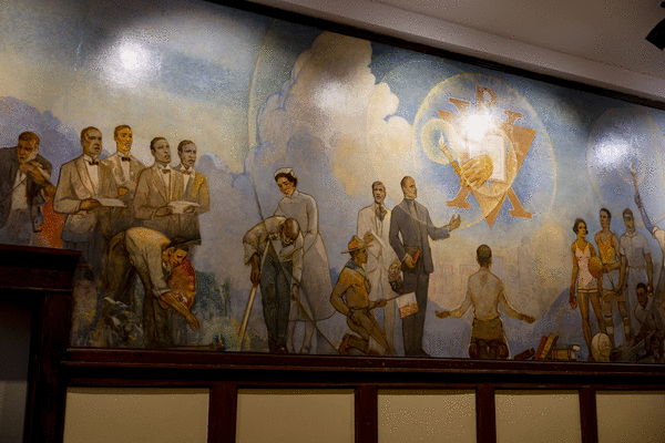 By the mid-’30s, its ballroom contained a mural celebrating all the building promised: a young man kneels in relief before the YMCA crest and Chicago skyline, surrounded by portraits of Black athletes and doctors and scientists and soldiers and pilots and artists.