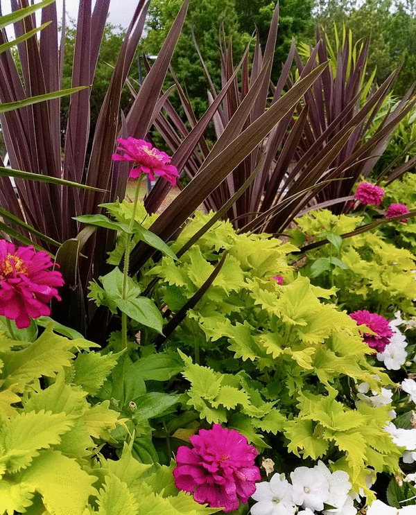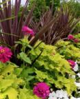 Son James has been ever so bold using Lime Time like a hedge in front of taller Red Star cordyline plants that gave a yucca like look. The bed also featured Uproar Rose zinnias and white SunPatiens.
