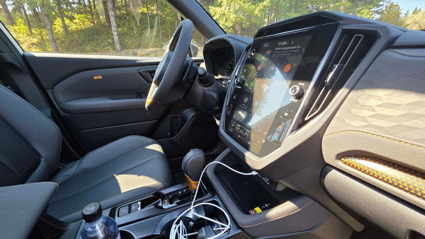 The Subie’s rear door inserts are similarly thoughtful. For its sixth gen, the center console has been redesigned for better storage: seat heaters are now in the screen, cupholders enlarged, the front phone charger more accessible. That phone charger — standard on all Foresters — is more important than ever as passengers use their phones’ Google Maps to navigate to the far reaches of, say, Oregon. Or Michigan.