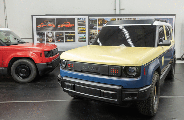 Slate trucks have a steel frame and external plastic panels that can be wrapped in any color. If customers want to paint their vehicle, they can do it themselves or take it to a partner shop.