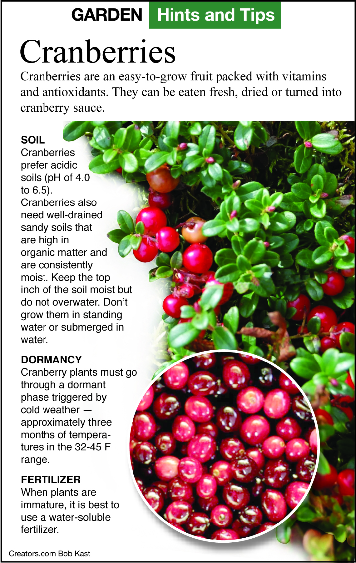 Many of you are also developing a taste for this native wetland plant. Sales of craisins (dried cranberries) are increasing. Cranberries are good for you; they are low in calories and have vitamins and minerals.