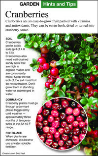 In the wild, cranberries grow in the full sun of sphagnum peat bogs. They will tolerate half sun sites. In the winter, they can be left flooded for a while, but not in the summer. Some commercial fields are left flooded in the winter to protect the plants from dry winter winds.