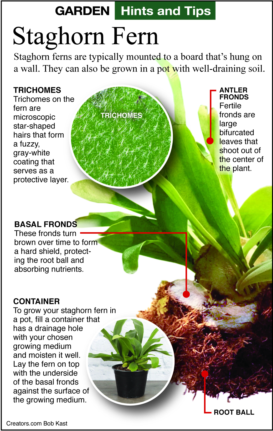 Q: I received a staghorn fern as a Christmas present. It is on a small wooden board. I don't have any place to hang it. Can I put it in a pot? What kind of soil should I use?