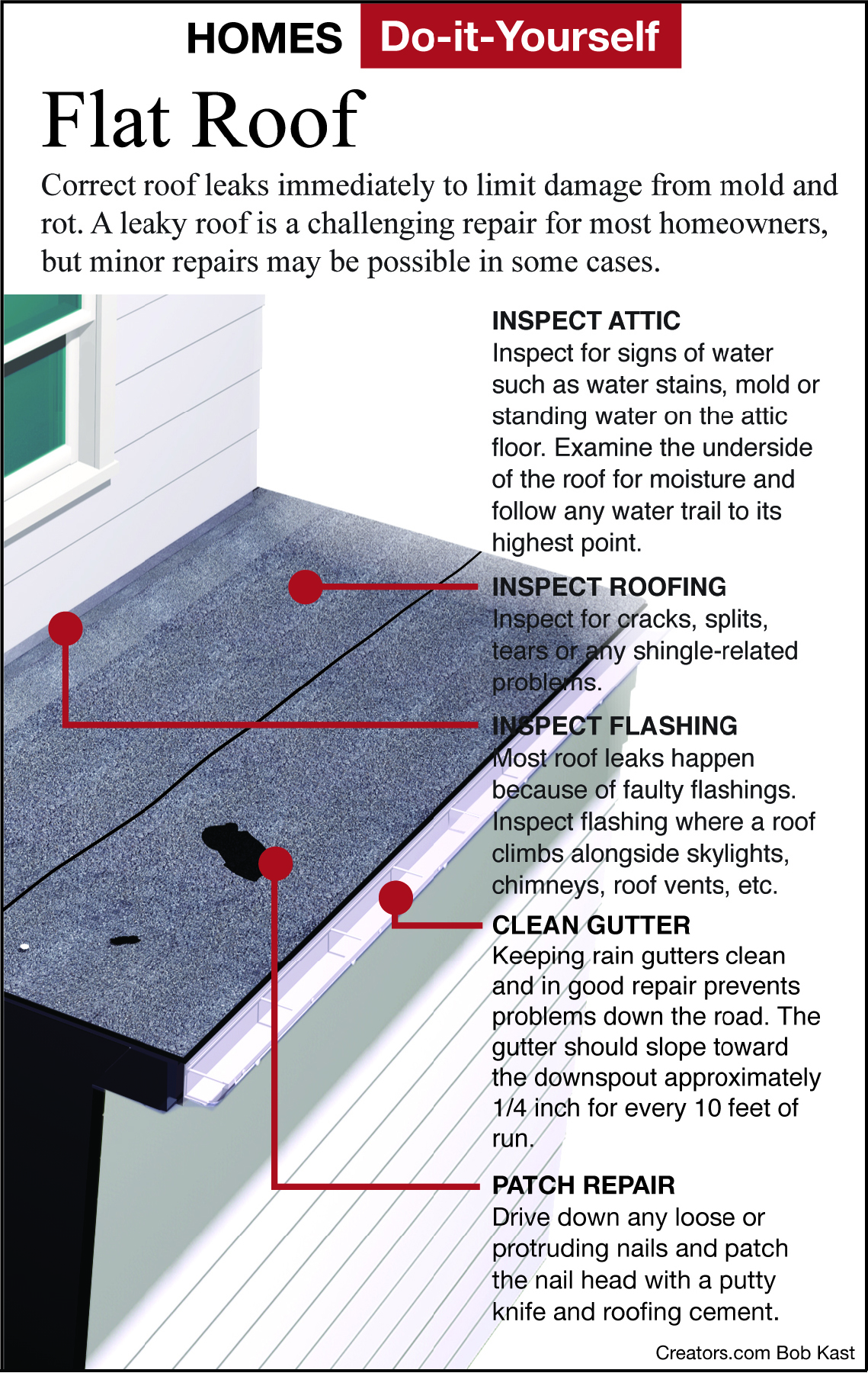 Dear Mindy: Although a flat roll roof is more prone to leaks than a typical pitched roof, there certainly are many leak-free flat roofs. It is wise to inspect a flat roof at least twice each year and preferably four times (once each season). Rainwater tends to puddle on a flat roof.