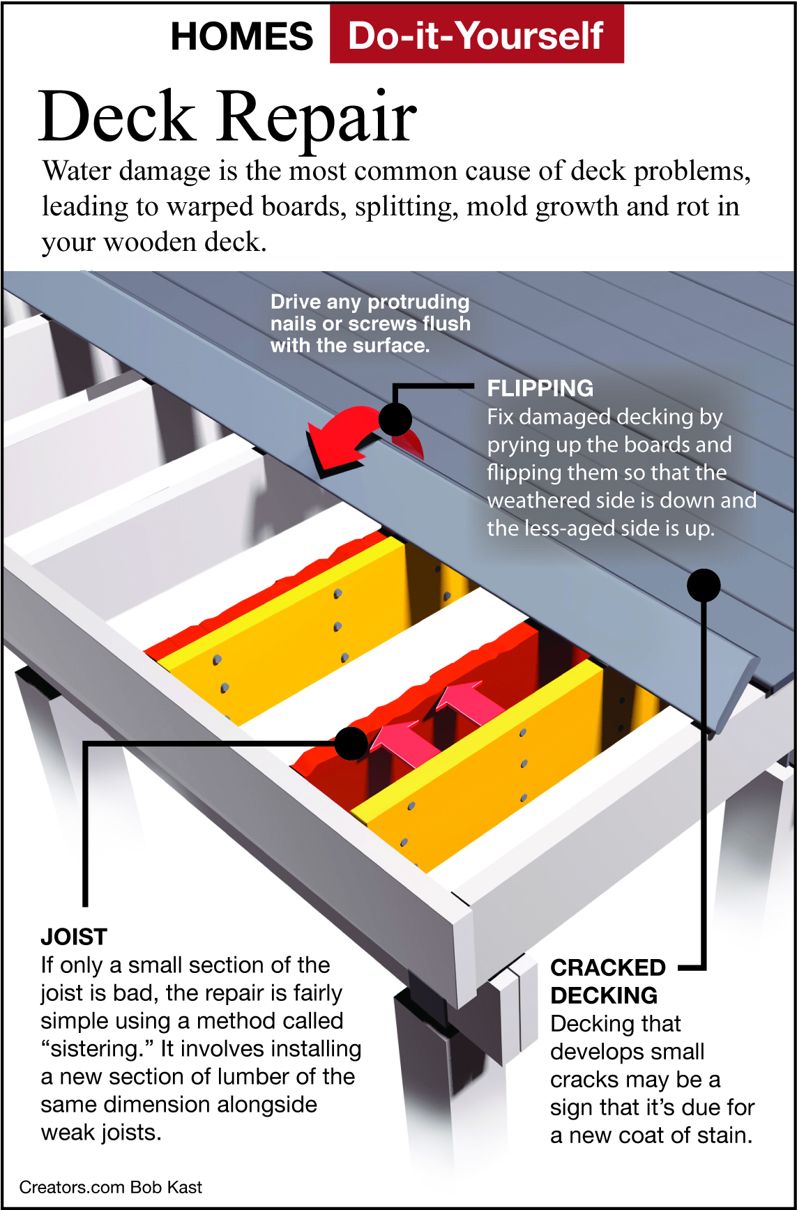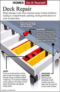 Dear James: The surface and some of the support lumber is deteriorating on my raised deck. How can I test the lumber integrity and repair the rotten areas? -- Anthony D.
