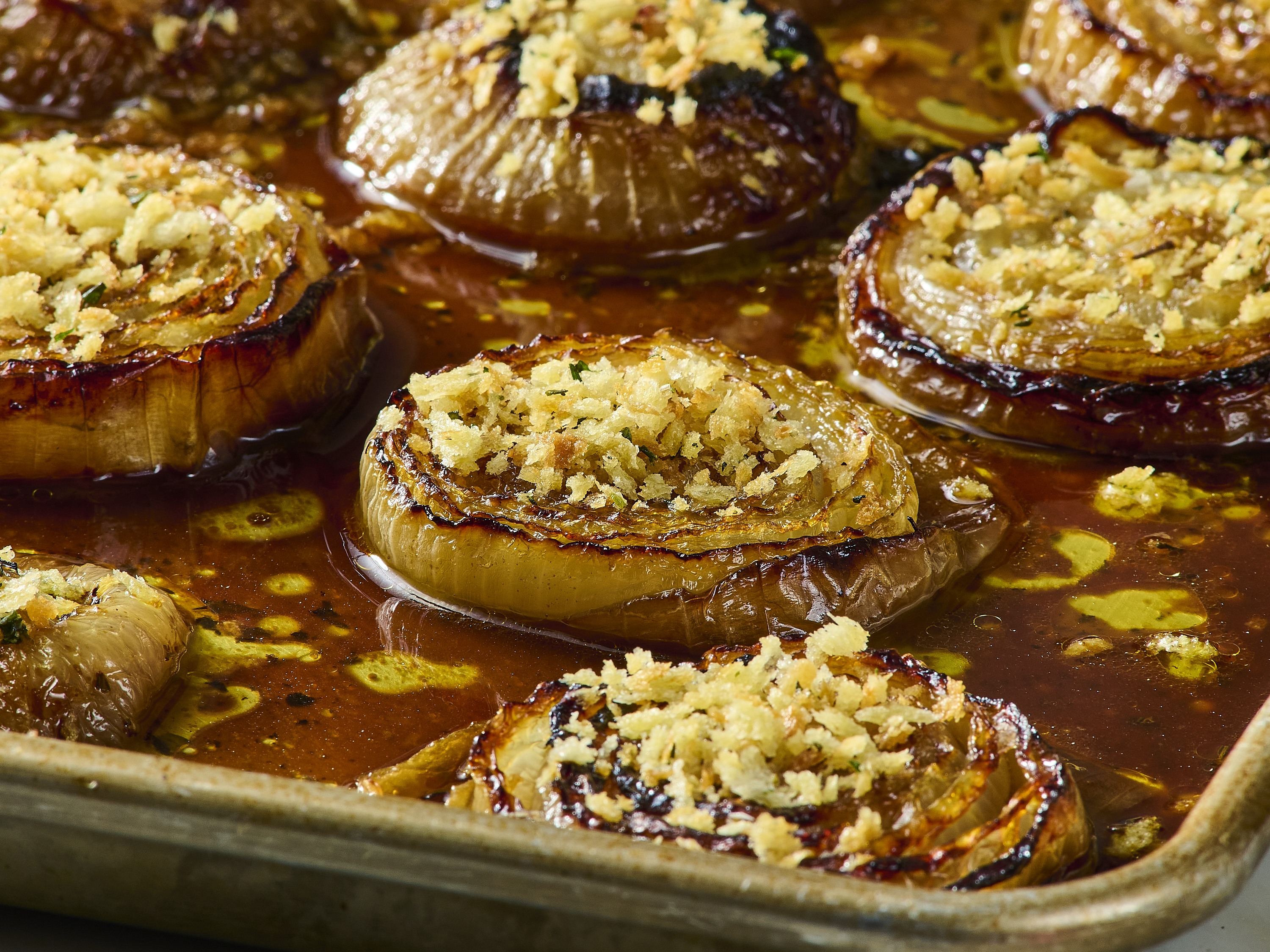 2. Pour in the broth mixture and roast until the onions are very tender, about 20 minutes more. Transfer to a serving platter and drizzle any remaining liquid in the pan over the onions. Sprinkle with the breadcrumb topping.