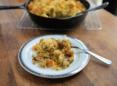 Fold in chestnuts.Transfer mixture to the buttered cast-iron skillet. Dot with a few pieces of butter on top.