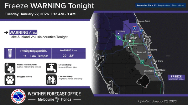 ORLANDO, Fla. — The National Weather Service in Melbourne has issued a freeze warning for parts of Central Florida for overnight into Tuesday morning with forecast temperatures expected to fall into the lower 30s.