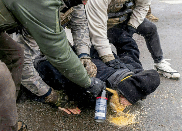 In the image, a male protester is face down on the pavement. The man is physically pinned by multiple agents, outnumbered and overpowered as one agent sprays a toxic chemical irritant directly at close range directly into their face.